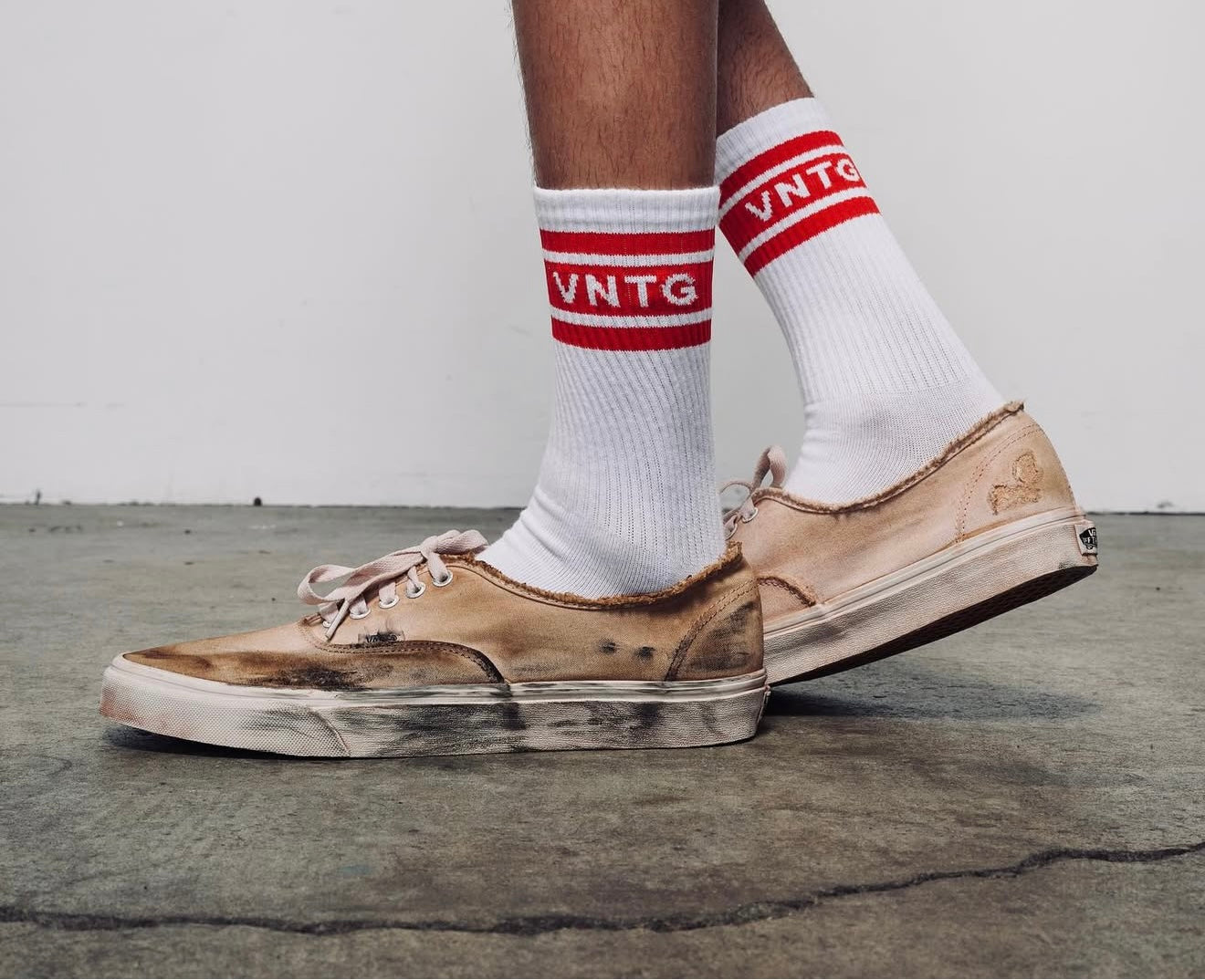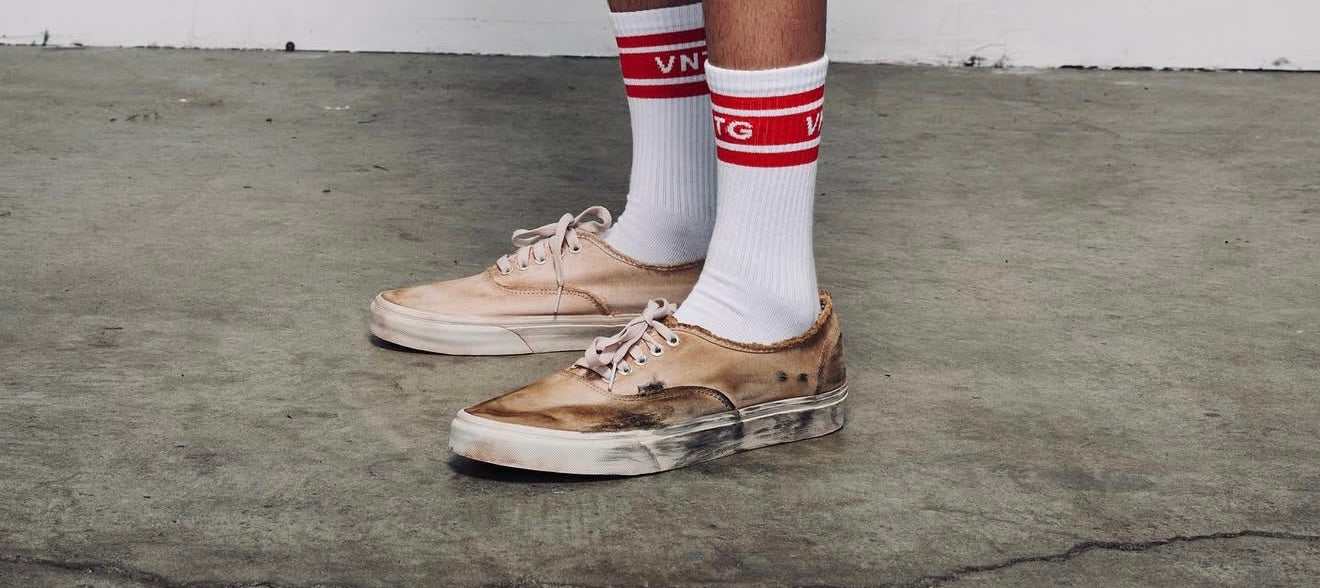 Each pair begins pristine — then meets the human hand. Scuffed, bruised, and worn through an aging ritual that mimics years of asphalt, oil, and movement. No machines. No shortcuts. Just time, friction, and intention.